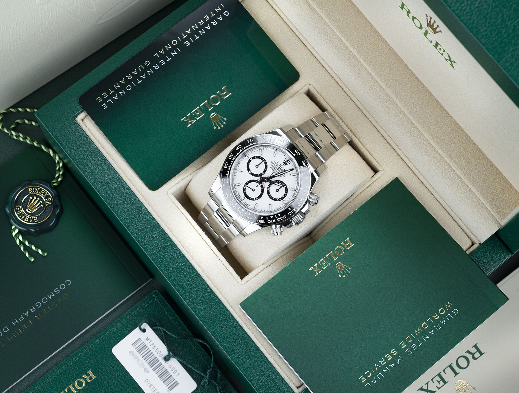 This brand new May 2025 Daytona ‘Panda’ comes complete with new stile box, books, wallet, warranty card, green tag and the remainder of it’s 5 year Rolex international warranty.